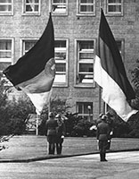 | © picture alliance Soldaten des Wachregiments hissen am 20. Juni 1974 im Hof des Staatsratsgebäudes in Ostberlin die Fahnen der Bundesrepublik Deutschland (r) und der Deutschen Demokratischen Republik. |
